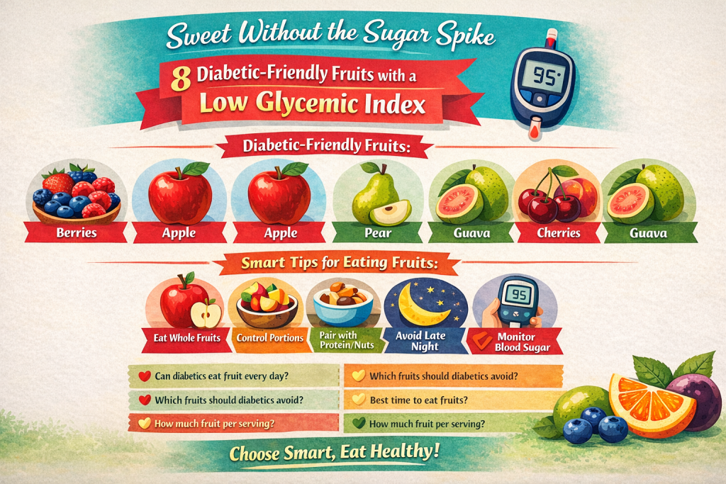Let’s explore 8 naturally sweet, diabetic-friendly fruits that have a low glycemic index and can be enjoyed safely by people with diabetes.